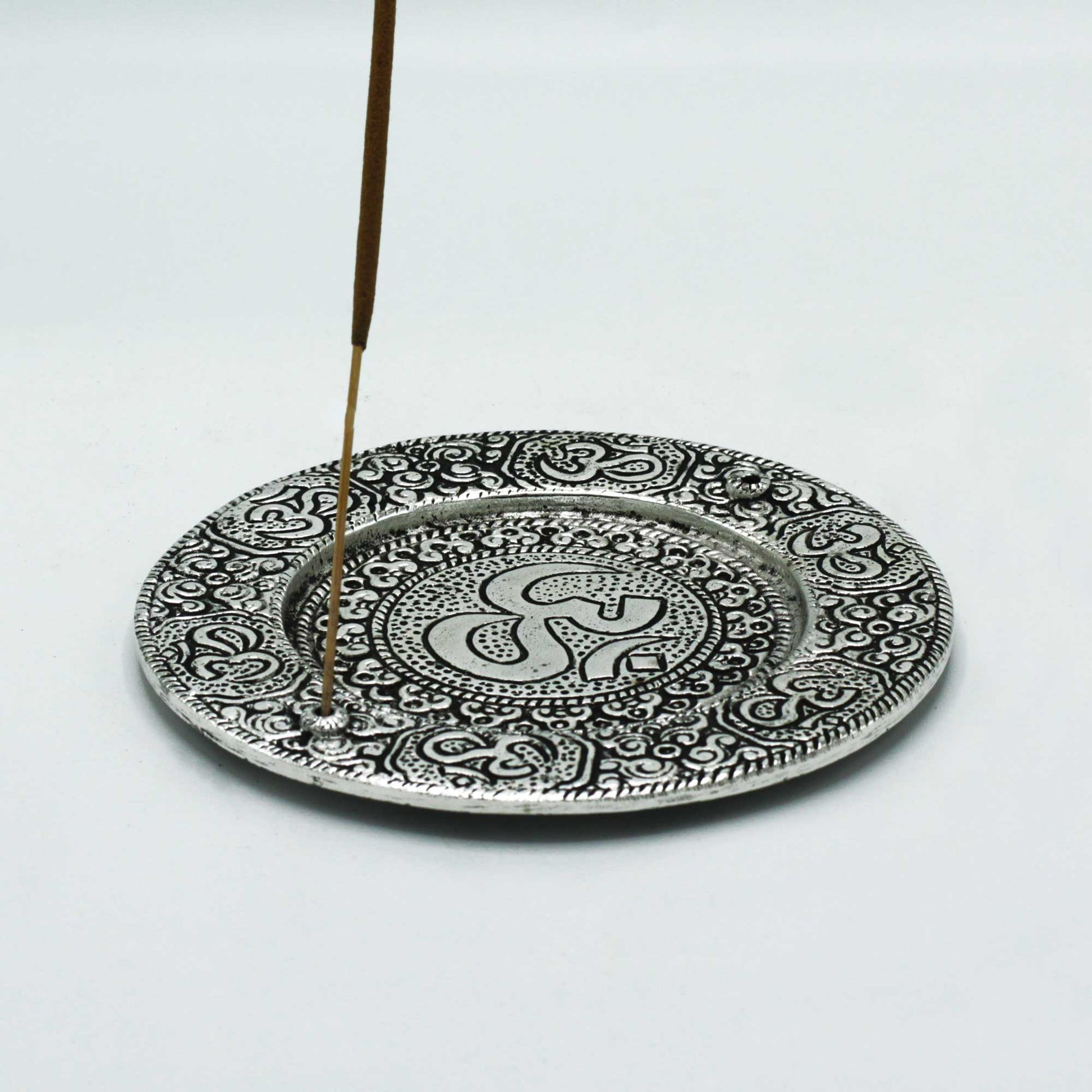 Okrągły uchwyt na kadzidełko Om z polerowanego aluminium 11 cm